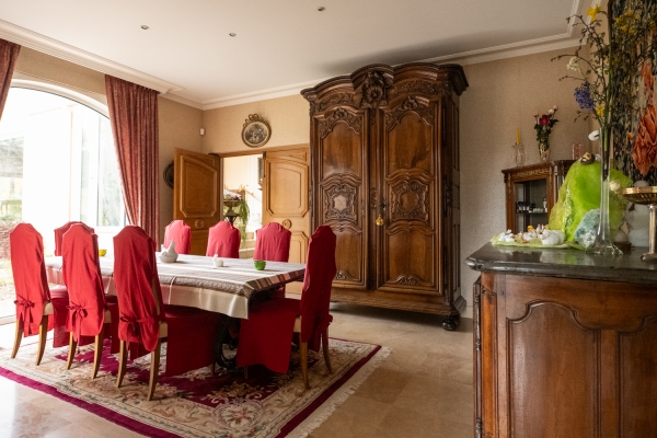 La maison propose 12 pièces aux proportions généreuses, sublimées par une hauteur sous plafond de 3,10 m et des sols en pierre de Bourgogne dans la majorité des espaces. L’ensemble offre une atmosphère élégante, chaleureuse et parfaitement adaptée à une vie familiale ou à la réception.